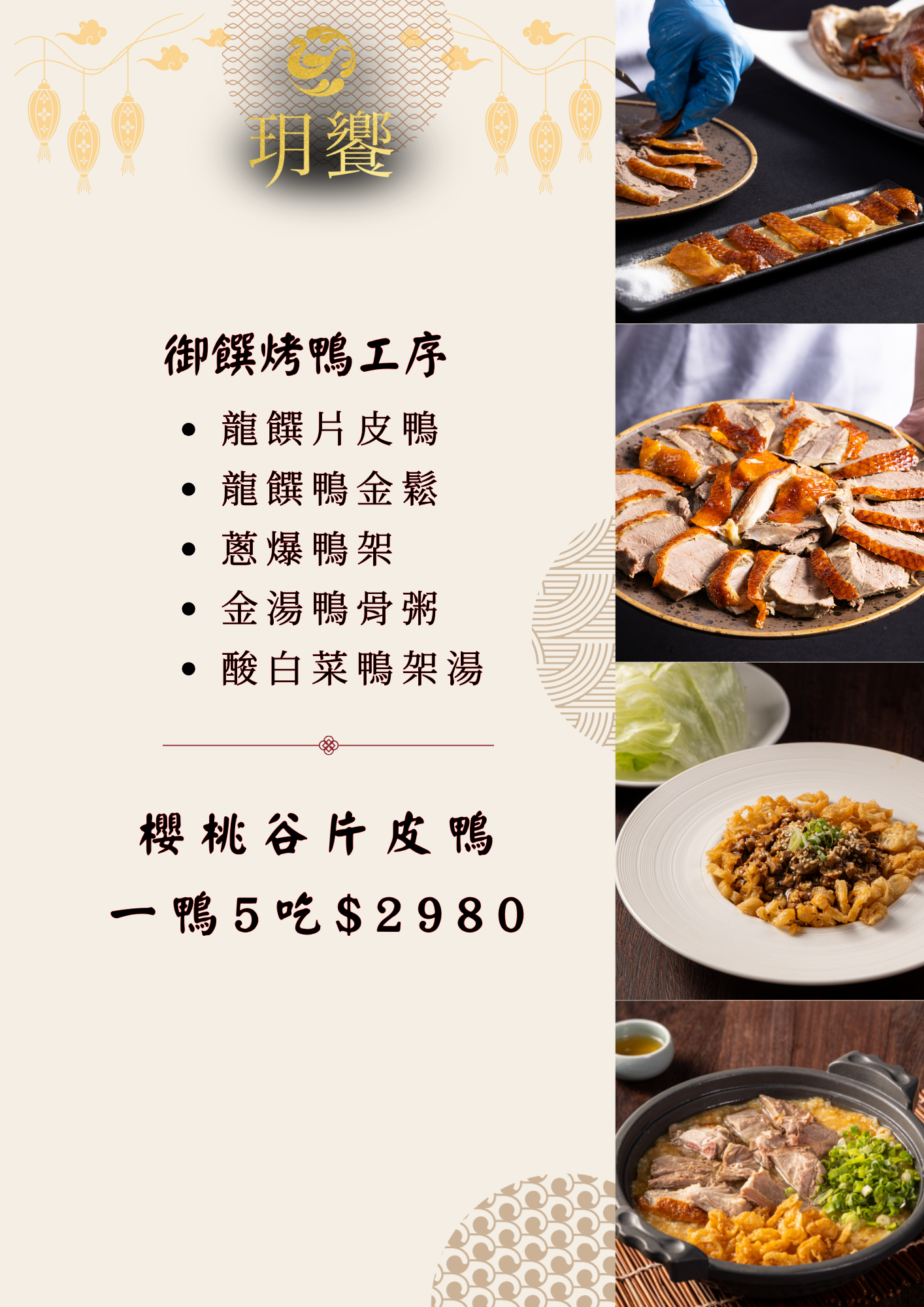 片皮鴨為晚餐限定,需預約、每時段限量 20 隻;桌邊服務、分趟上菜,品質穩定。